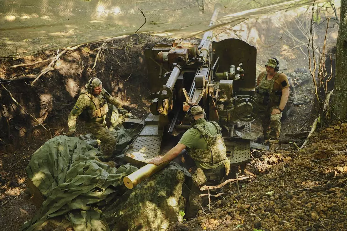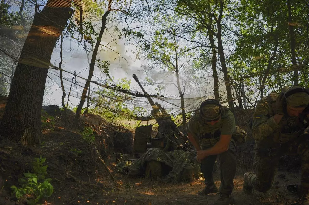 In this photo provided by Ukraine's 127th Separate Brigade of the Territorial Defence press service, soldiers fire a canon towards Russian army positions near Kharkiv, Ukraine, Monday, June 2, 2025, (Anatolii Lysianskyi/Ukraine's 127th Separate Brigade via AP)