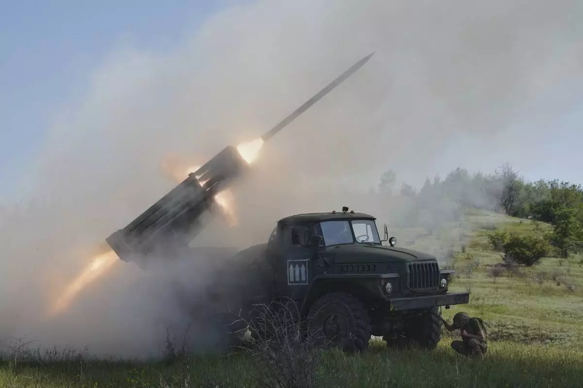 Soldiers of Ukraine's 30th Separate Mechanized Brigade fire a Grad multiple rocket launcher towards Russian positions at the frontline in Donetsk region, Ukraine, Tuesday, June 3, 2025. (AP Photo/Andrii Marienko)