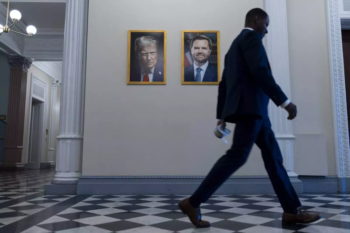 The new official portraits of President Donald Trump and Vice President JD Vance hang in the Eisenhower Executive Office Building on the White House campus, Monday, June 2, 2025, in Washington. (AP Photo/Alex Brandon)