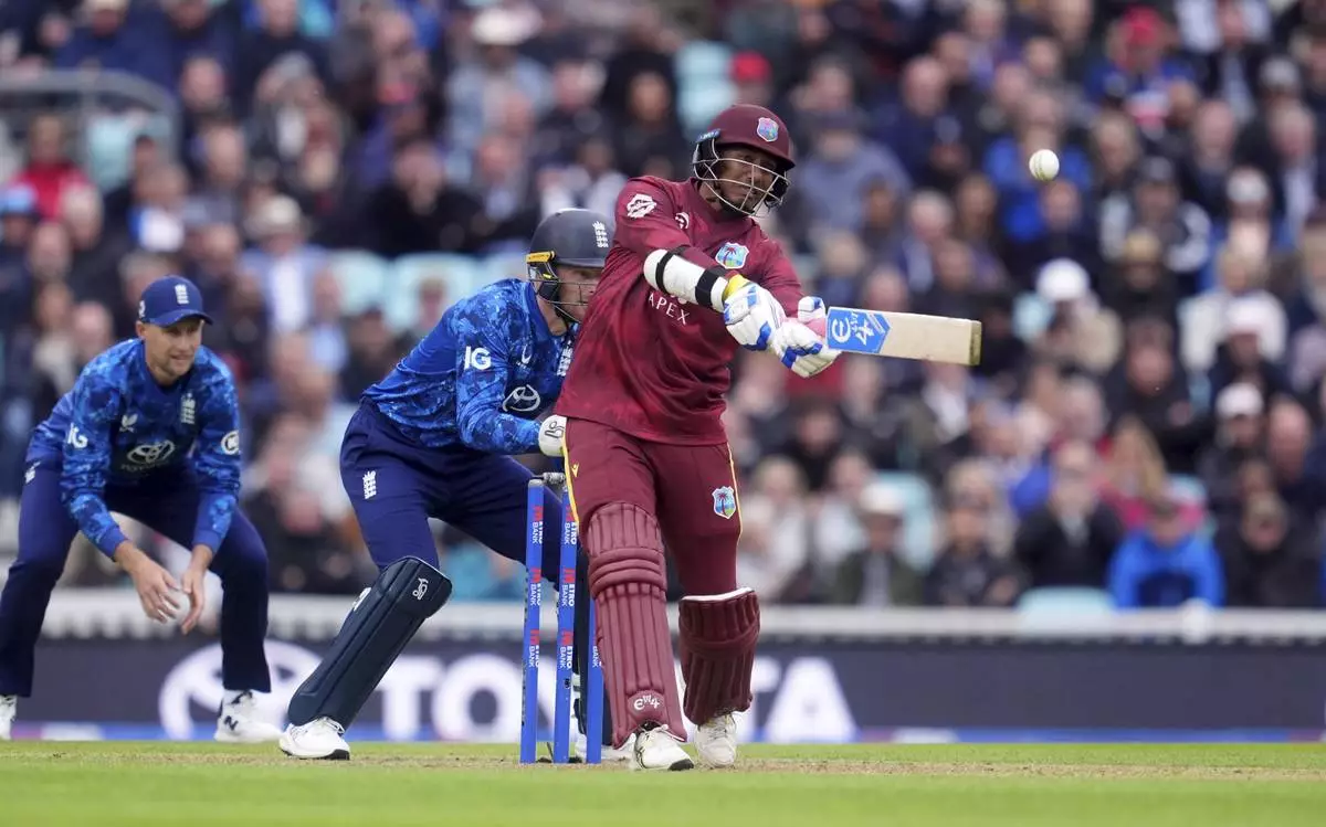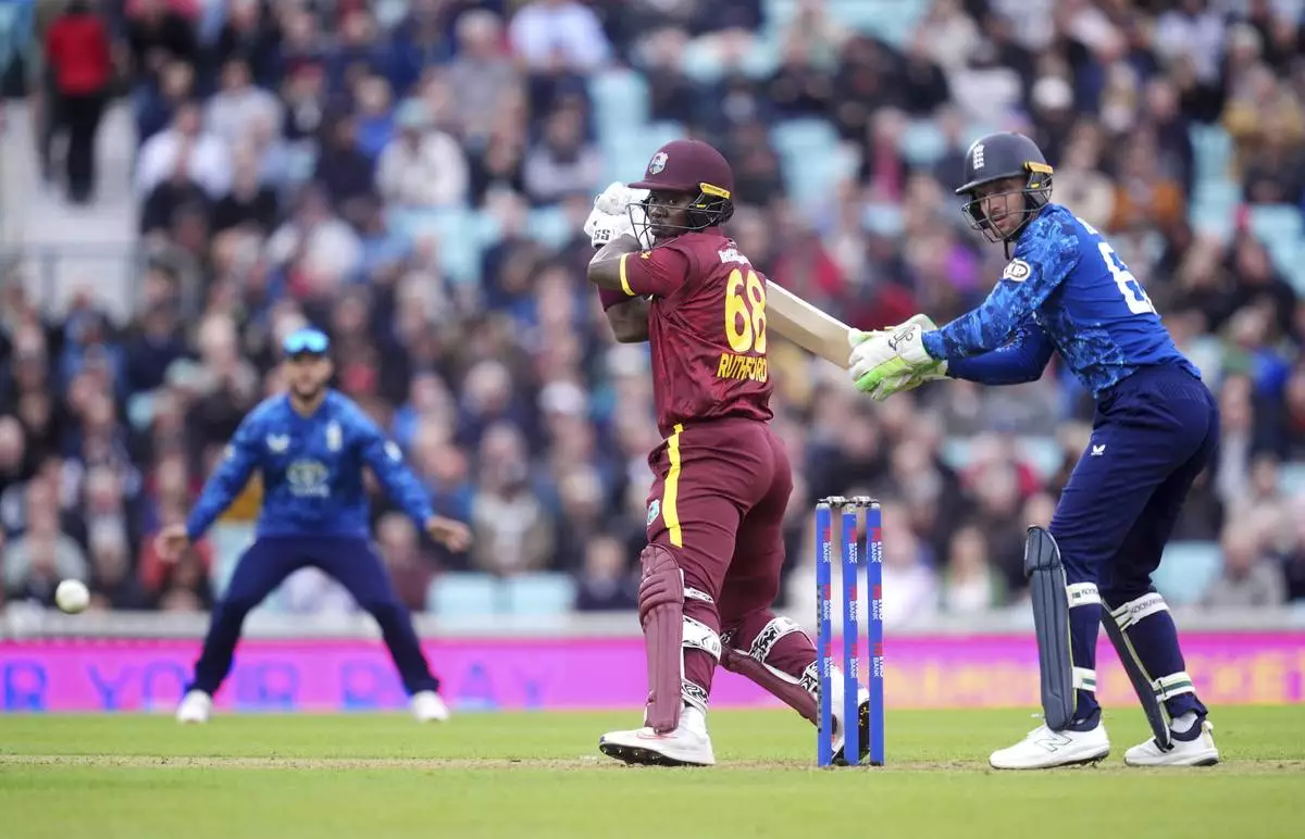 West Indies' Sherfane Rutherford bats during the third One Day International cricket match between West Indies and England at Oval, London, Tuesday June 3, 2025. (Adam Davy/PA via AP)
