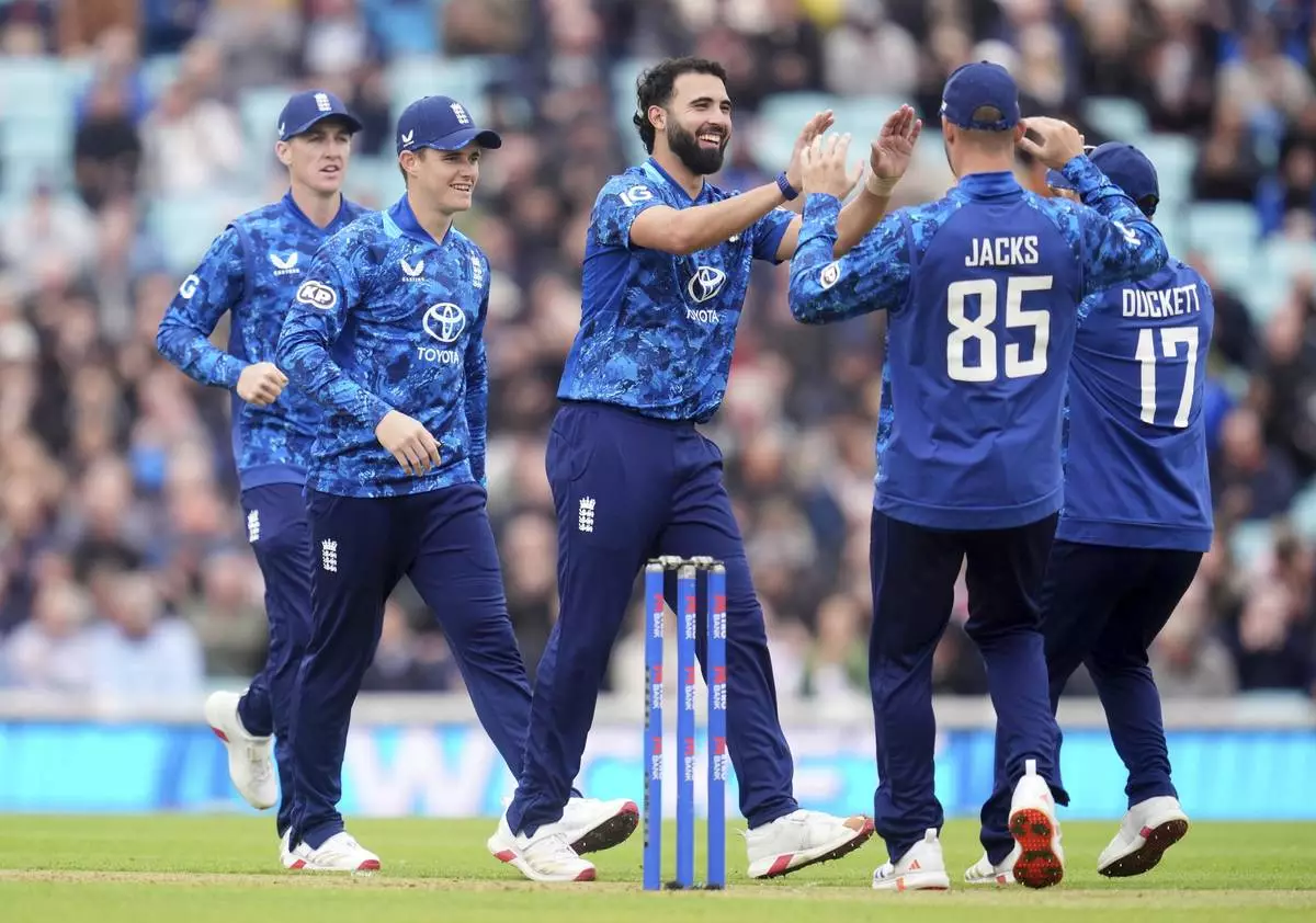 England's Saqib Mahmood, center left, celebrates the wicket of West Indies batter Shai Hope during the third One Day International cricket match between West Indies and England at Oval, London, Tuesday June 3, 2025. (Adam Davy/PA via AP)
