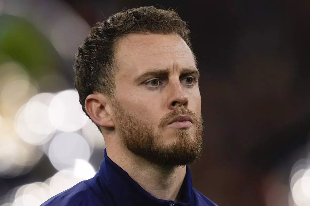 FILE - Netherlands' goalkeeper Mark Flekken during the line-up prior to the international friendly soccer match between Netherlands and Scotland at the Johan Cruyff ArenA, in Amsterdam, Netherlands, March 22, 2024. (AP Photo/Peter Dejong, file)