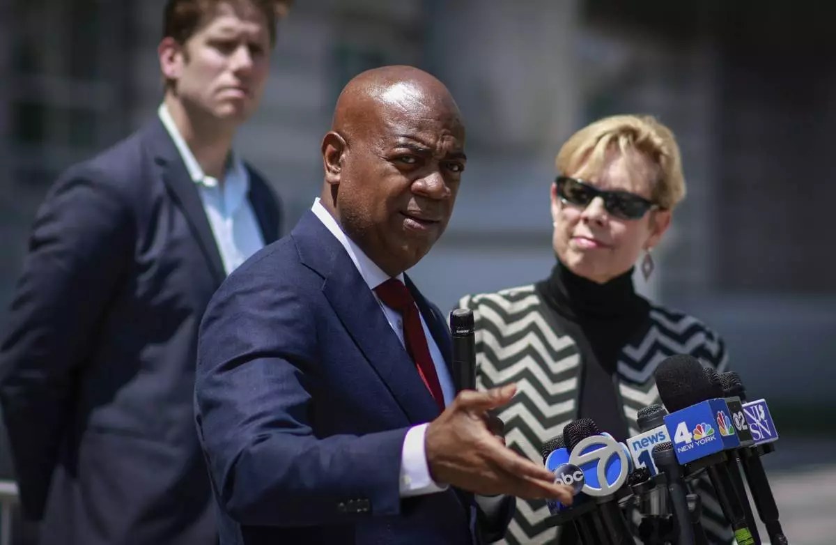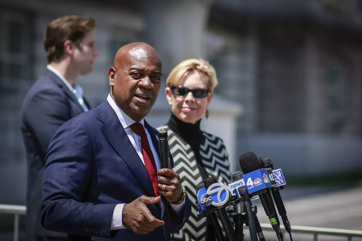Newark Mayor Ras Baraka speaks next to civil rights attorney Nancy Erika Smith, right, as they attend a press conference regarding his May 9th arrest at Delaney Hall, outside U.S. District Court for the District of New Jersey Tuesday, June 3, 2025, in Newark N.J. (AP Photo/Kena Betancur)