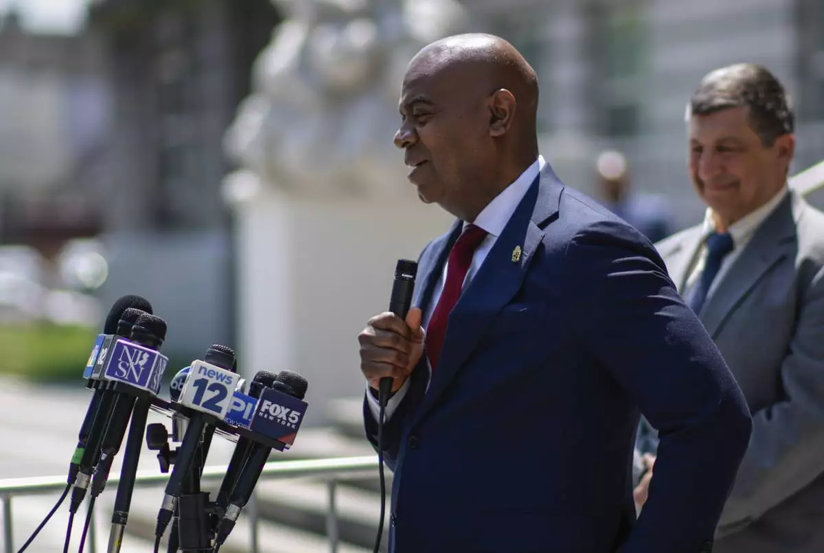 Newark Mayor Ras Baraka speaks as he attends a press conference regarding his May 9th arrest at Delaney Hall, outside U.S. District Court for the District of New Jersey Tuesday, June 3, 2025, in Newark, N.J. (AP Photo/Kena Betancur)