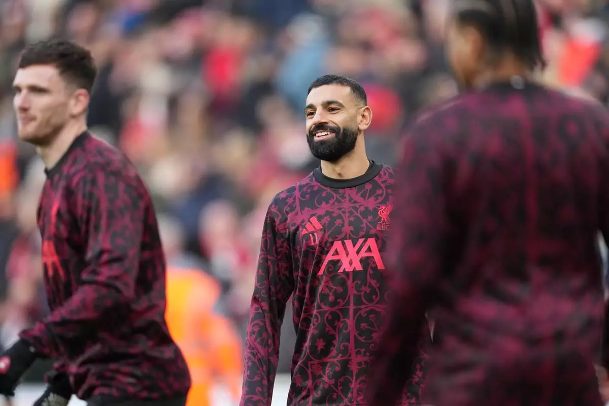 Liverpool's Mohamed Salah warms up prior to the English Premier League soccer match between Liverpool and Brighton and Hove Albion in Liverpool, England, Saturday, Dec. 13, 2025. (AP Photo/Jon Super)