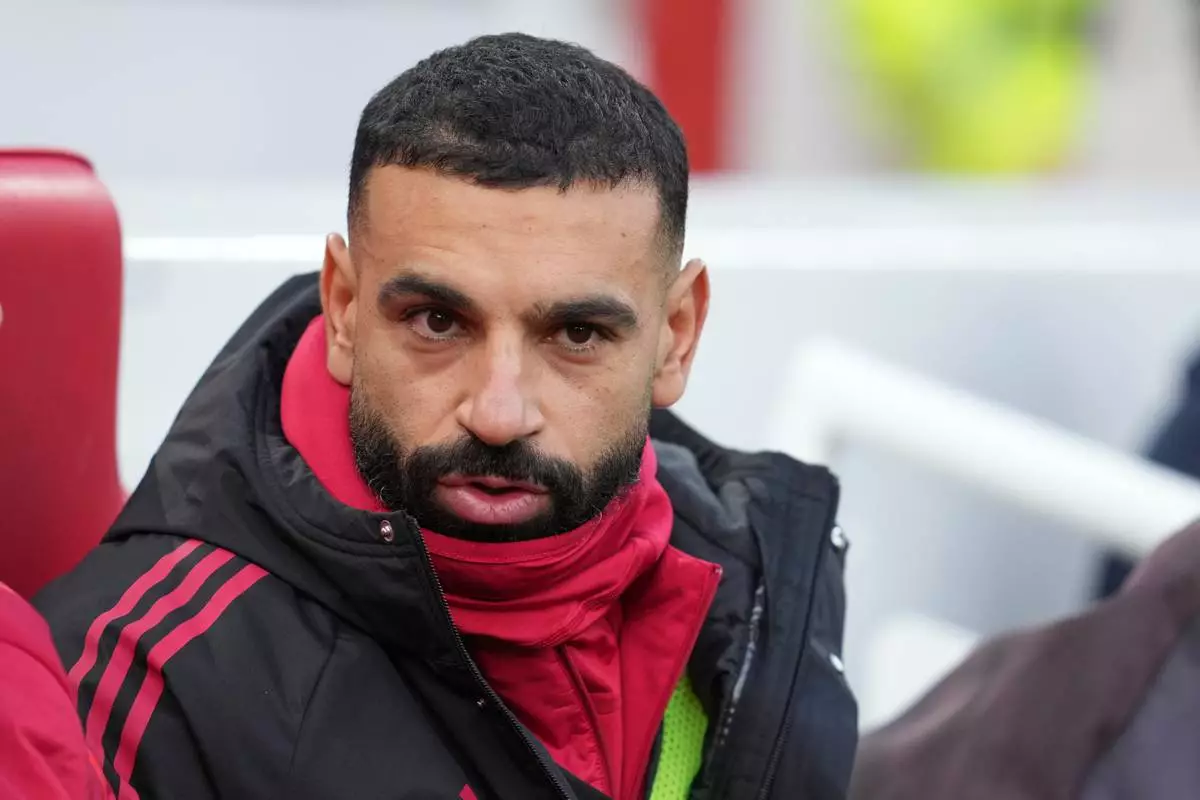 Liverpool's Mohamed Salah sits on the bench before the English Premier League soccer match between Liverpool and Brighton and Hove Albion in Liverpool, England, Saturday, Dec. 13, 2025. (AP Photo/Jon Super)