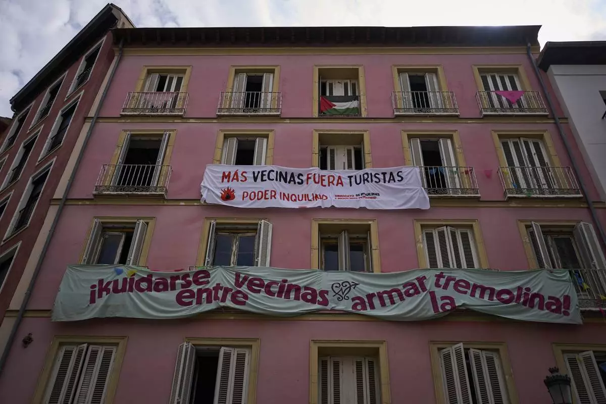 Banners against tourist holiday rentals hang on the facade of a building in downtown Madrid, Spain, Tuesday, June 3, 2025. The writing in Spanish reads: "More neighbors, fewer tourists. Tenant power," and "Looking out for each other as neighbors, stirring things up." (AP Photo/Manu Fernandez)