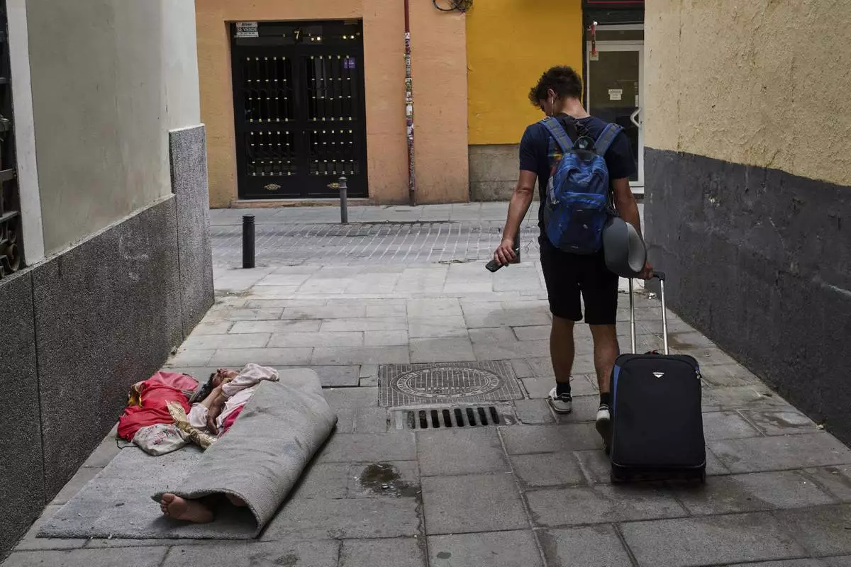 A tourist walks past a homeless woman in downtown Madrid, Spain, Tuesday, June 3, 2025. (AP Photo/Bernat Armangue)