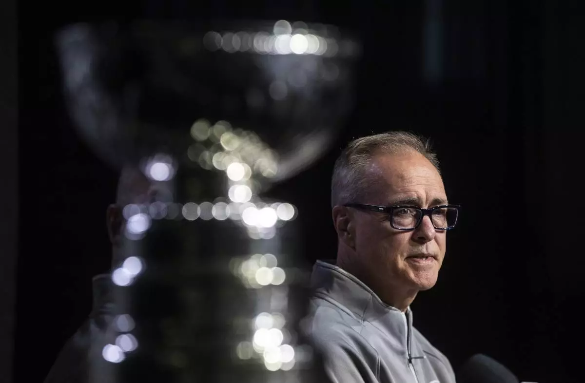 Florida Panthers' head coach Paul Maurice speak to media during a news conference, Tuesday, June 3, 2025, in Edmonton, Alberta, ahead of Game 1 of the NHL hockey Stanley Cup final series against the Edmonton Oilers. (Jason Franson/The Canadian Press via AP)