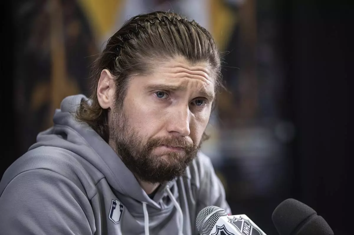 Florida Panthers goalie Sergei Bobrovsky (72) speaks to media during a news conference, Tuesday, June 3, 2025, in Edmonton, Alberta, ahead of Game 1 of the NHL hockey Stanley Cup final series against the Edmonton Oilers. (Jason Franson/The Canadian Press via AP)