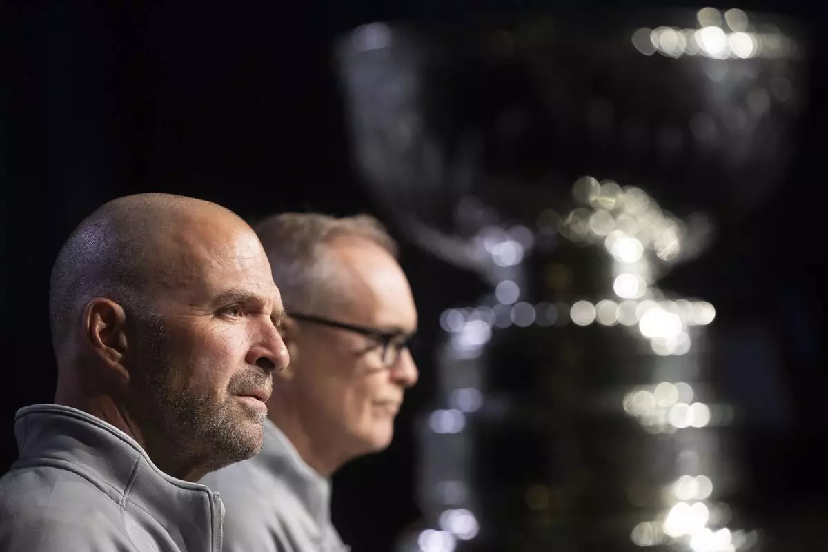 Florida Panthers' general manager Bill Zito, left, and head coach Paul Maurice speak to media during a news conference, Tuesday, June 3, 2025, in Edmonton, Alberta, ahead of Game 1 of the NHL hockey Stanley Cup final series against the Edmonton Oilers. (Jason Franson/The Canadian Press via AP)