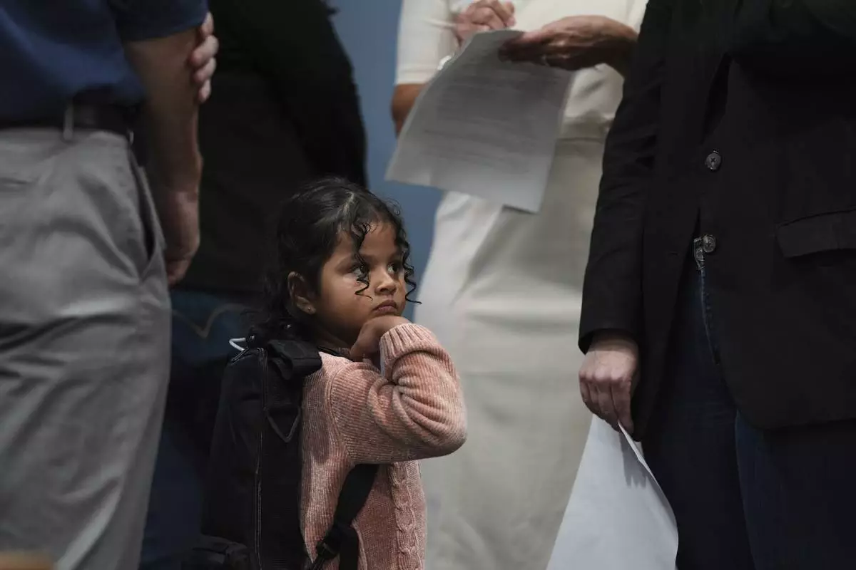 A 4-year-old Mexican girl, who has short bowel syndrome, attends a news conference in Los Angeles, Wednesday, May 28, 2025, after her and her mother's humanitarian parole was terminated and they were ordered to self-deport. (AP Photo/Jae C. Hong)