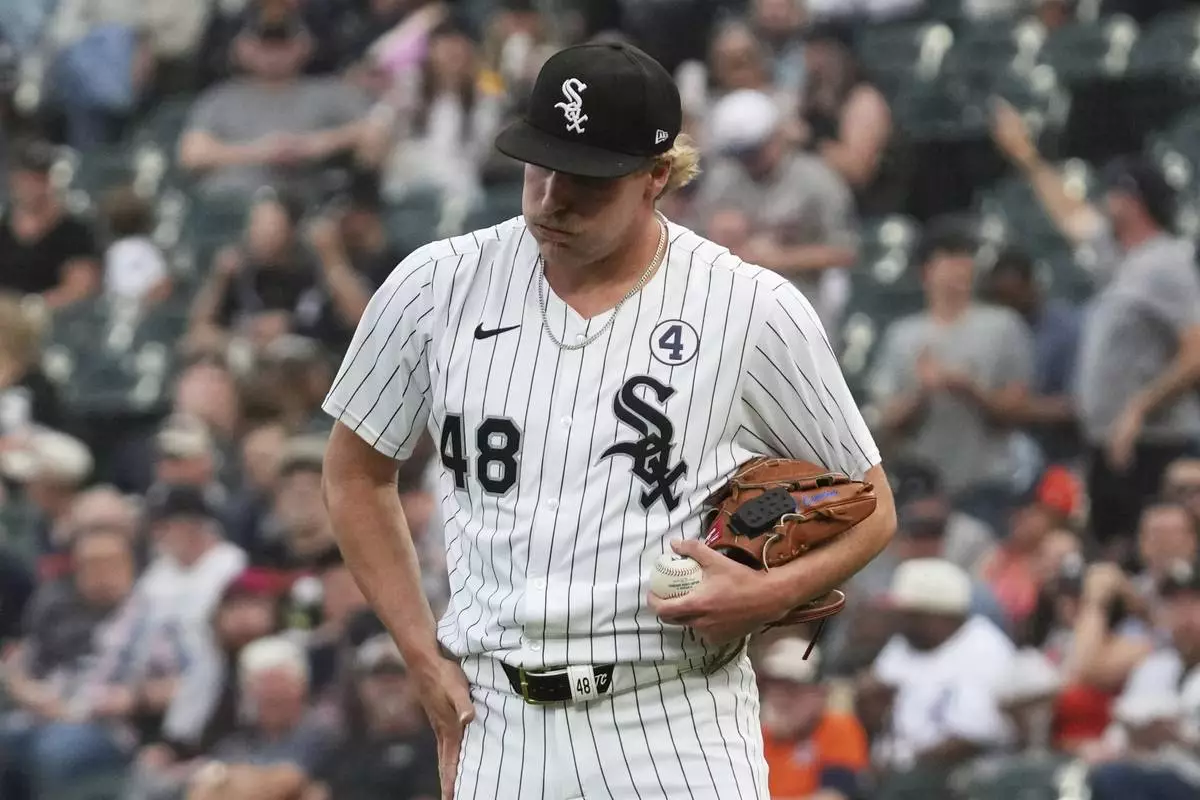 Chicago White Sox starting pitcher Jonathan Cannon reacts after Detroit Tigers' Kerry Carpenter hit a two-run home run during the first inning of a baseball game in Chicago, Monday, June 2, 2025. (AP Photo/Nam Y. Huh)