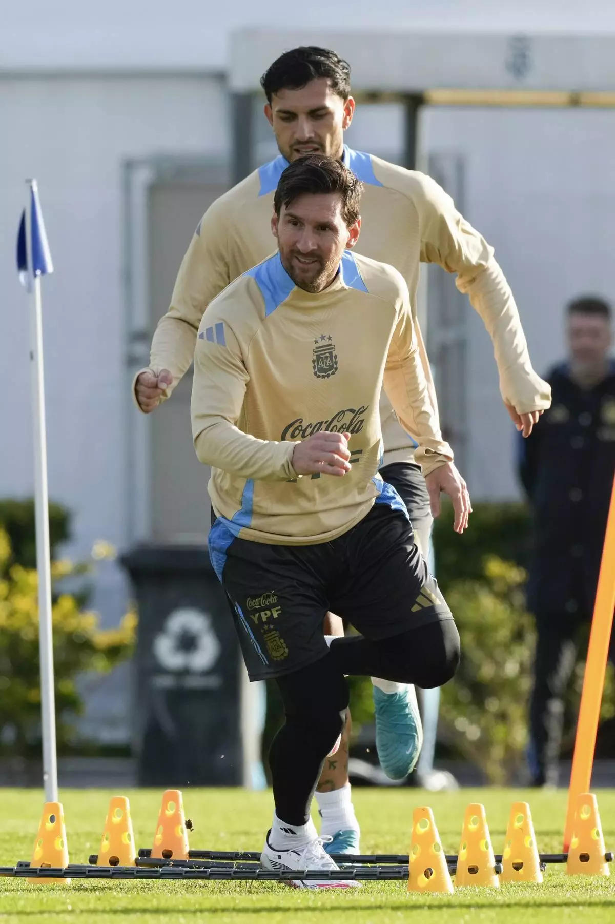 Argentina's Lionel Messi, front, and Leandro Paredes train ahead of a World Cup 2026 qualifier against Chile at the Argentina Soccer Association in Buenos Aires, Argentina, Tuesday, June 3, 2025. (AP Photo/Gustavo Garello)