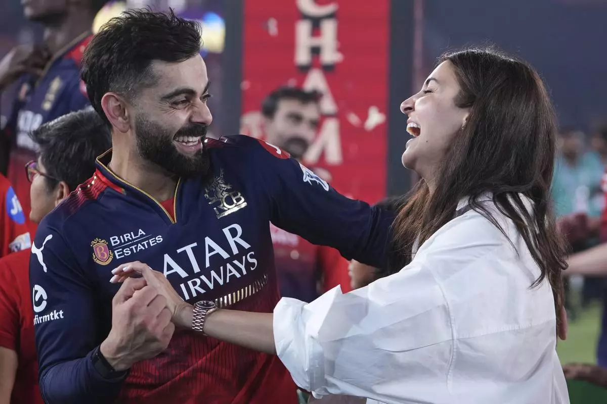 Royal Challengers Bengaluru's Virat Kohli shares a laugh with his wife Anushka Sharma after his team's win in the Indian Premier League final cricket match against Punjab Kings at Narendra Modi Stadium in Ahmedabad, India, Wednesday, June 4, 2025. (AP Photo/Ajit Solanki)