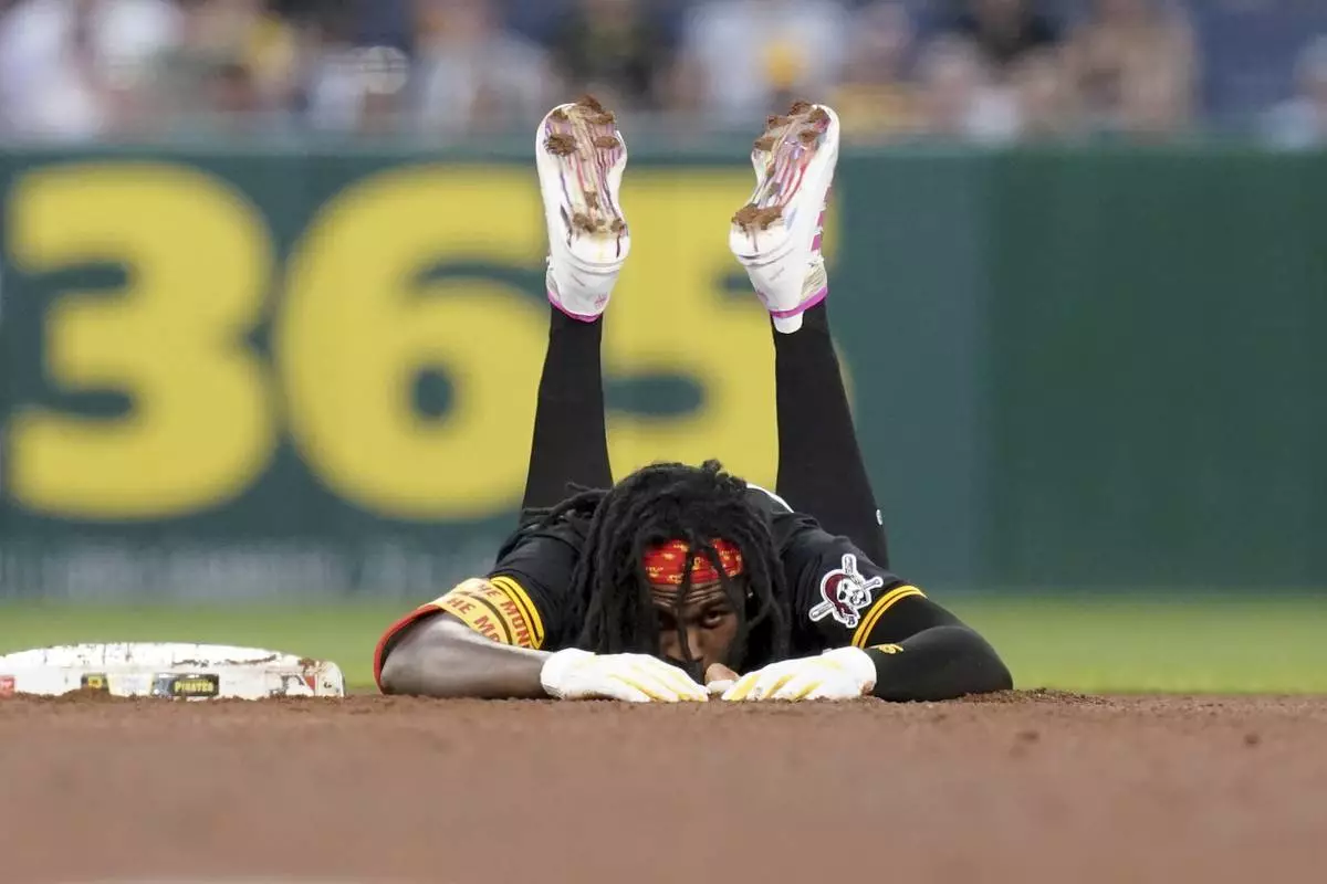 Pittsburgh Pirates' Oneil Cruz reacts after getting tagged out on a steal attempt during the eighth inning of a baseball game against the Houston Astros, Tuesday, June 3, 2025, in Pittsburgh. (AP Photo/Matt Freed)