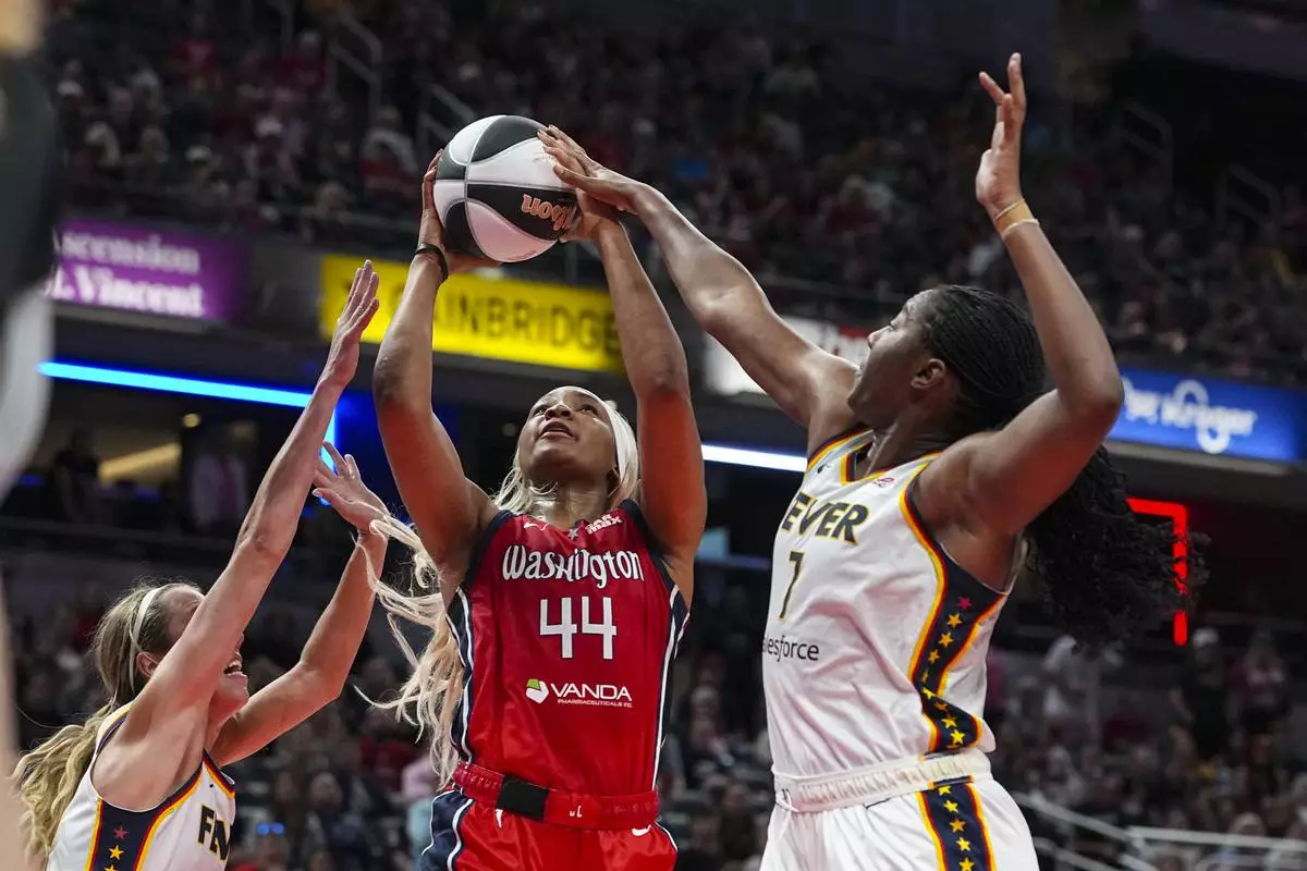 Washington Mystics forward Kiki Iriafen (44) shoots between Indiana Fever guard Lexie Hull (10) and forward Aliyah Boston (7) in the second half of a WNBA basketball game in Indianapolis, Tuesday, June 3, 2025. (AP Photo/Michael Conroy)