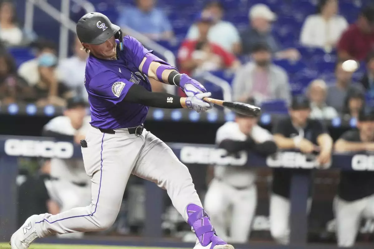 Colorado Rockies' Hunter Goodman hits a solo home run during the eighth inning of a baseball game against the Miami Marlins, Tuesday, June 3, 2025, in Miami. (AP Photo/Lynne Sladky)