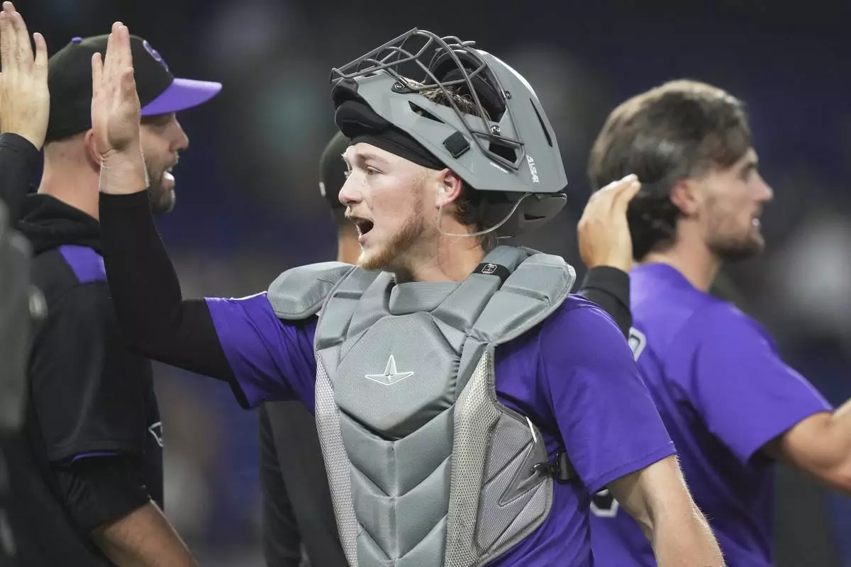 Colorado Rockies catcher Hunter Goodman high-fives with his teammates after the Rockies defeated the Miami Marlins in a baseball game, Tuesday, June 3, 2025, in Miami. (AP Photo/Lynne Sladky)