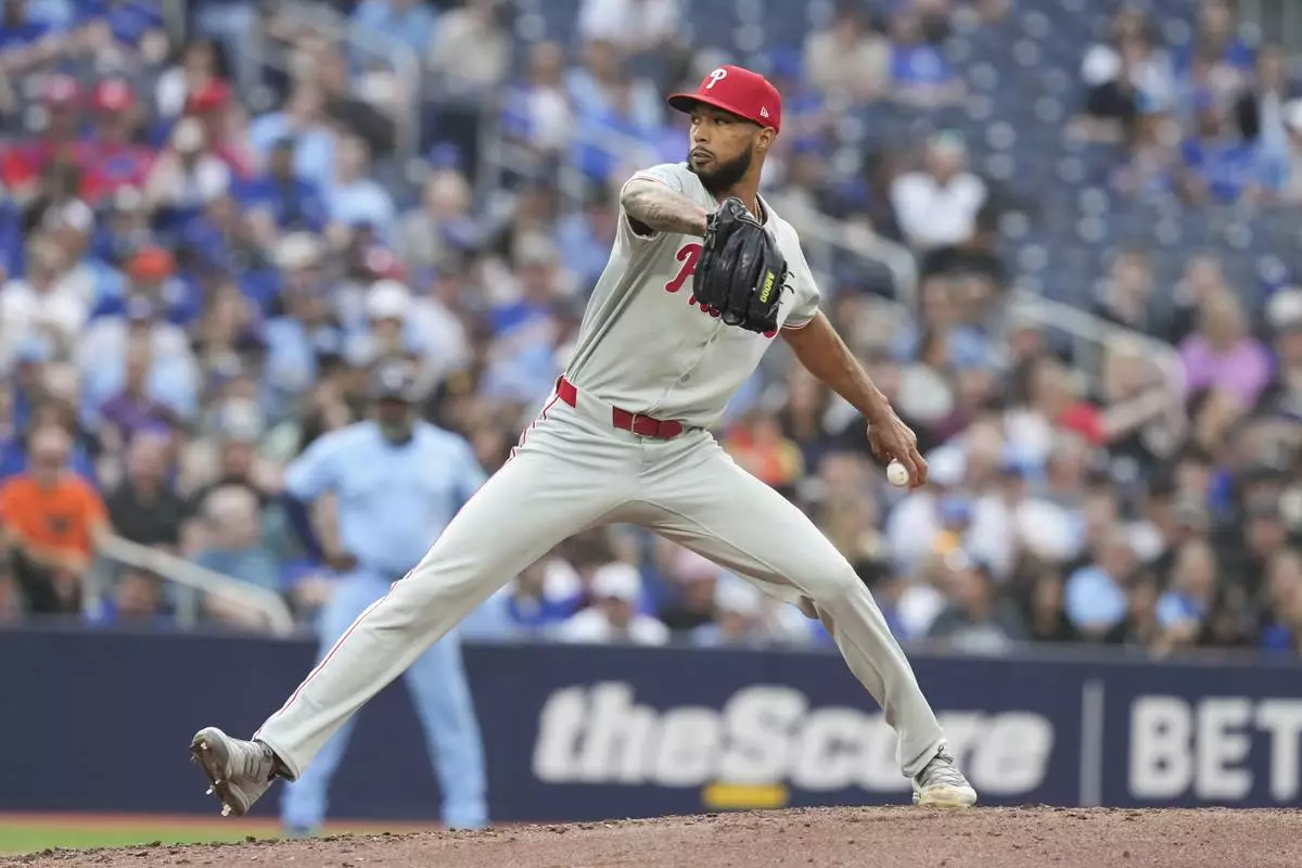 Philadelphia Phillies pitcher Cristopher Sánchez (61) works against the Toronto Blue Jays during the first inning of a baseball game in Toronto, Tuesday June 3, 2025. (Chris Young/The Canadian Press via AP)