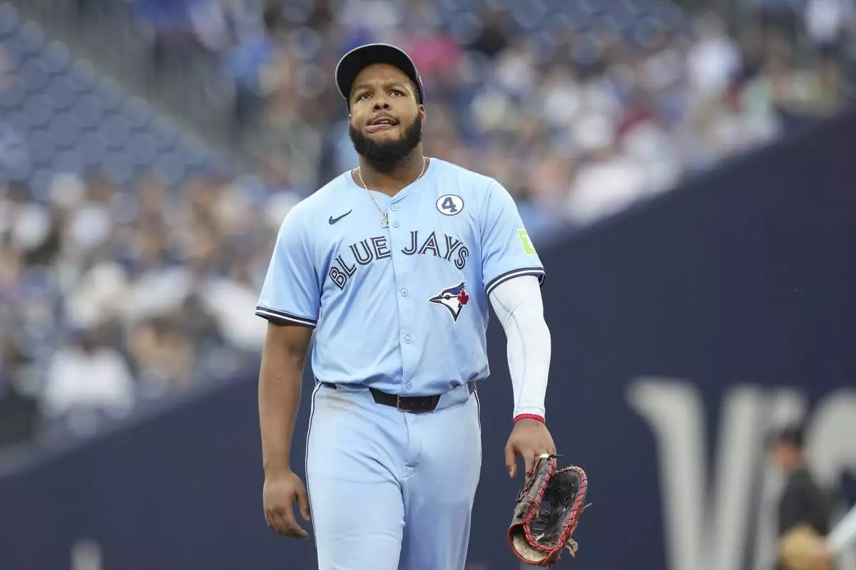 Toronto Blue Jays first baseman Vladimir Guerrero Jr. (27) reacts during the second inning of a baseball game against the Philadelphia Phillies in Toronto, Tuesday June 3, 2025. (Chris Young/The Canadian Press via AP)