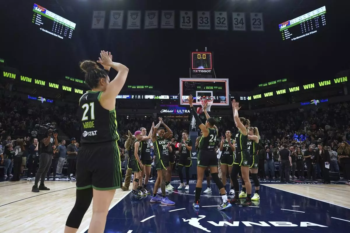 Minnesota Lynx players celebrate after a WNBA basketball game against the Phoenix Mercury, Tuesday, June 3, 2025, in Minneapolis. (AP Photo/Abbie Parr)