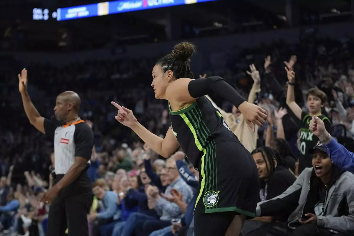 Minnesota Lynx guard Kayla McBride (21) points after making a three-point shot during the second half of a WNBA basketball game against the Phoenix Mercury, Tuesday, June 3, 2025, in Minneapolis. (AP Photo/Abbie Parr)
