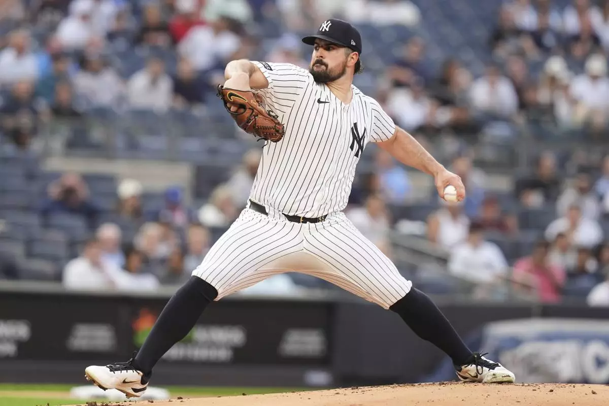 New York Yankees' Carlos Rodón pitches during the first inning of a baseball game against the Cleveland Guardians, Tuesday, June 3, 2025, in New York. (AP Photo/Frank Franklin II)