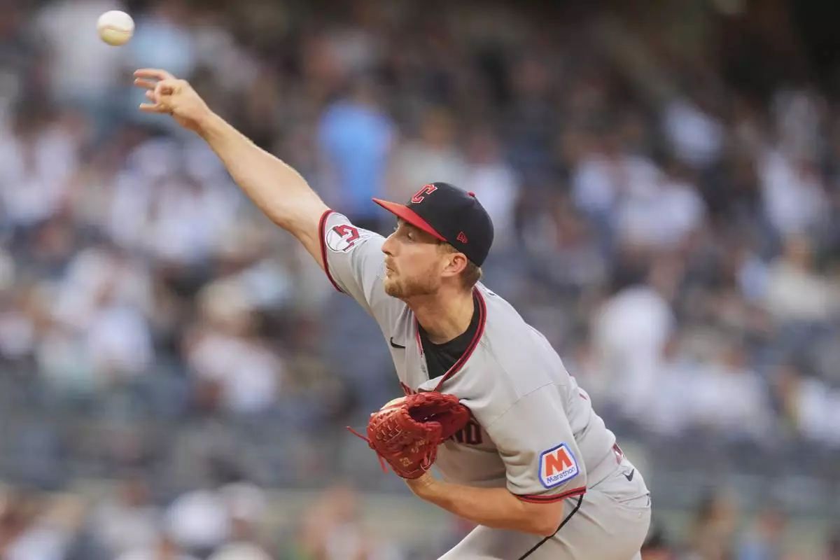 Cleveland Guardians' Tanner Bibee pitches during the first inning of a baseball game against the New York Yankees, Tuesday, June 3, 2025, in New York. (AP Photo/Frank Franklin II)
