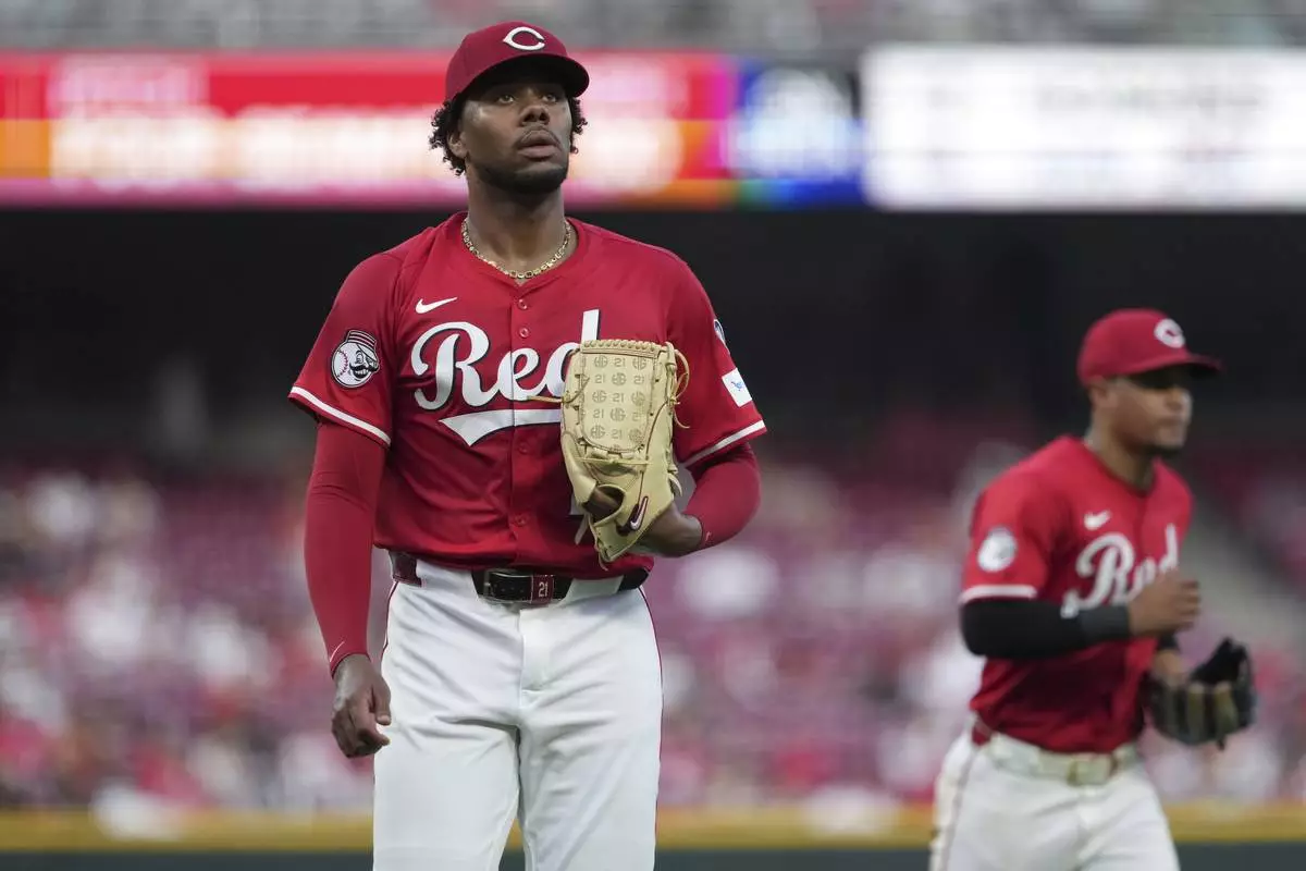 Cincinnati Reds' Hunter Greene walks to the dugout in the fifth inning of a baseball game against the Milwaukee Brewers, Tuesday, June 3, 2025, in Cincinnati. (AP Photo/Kareem Elgazzar)