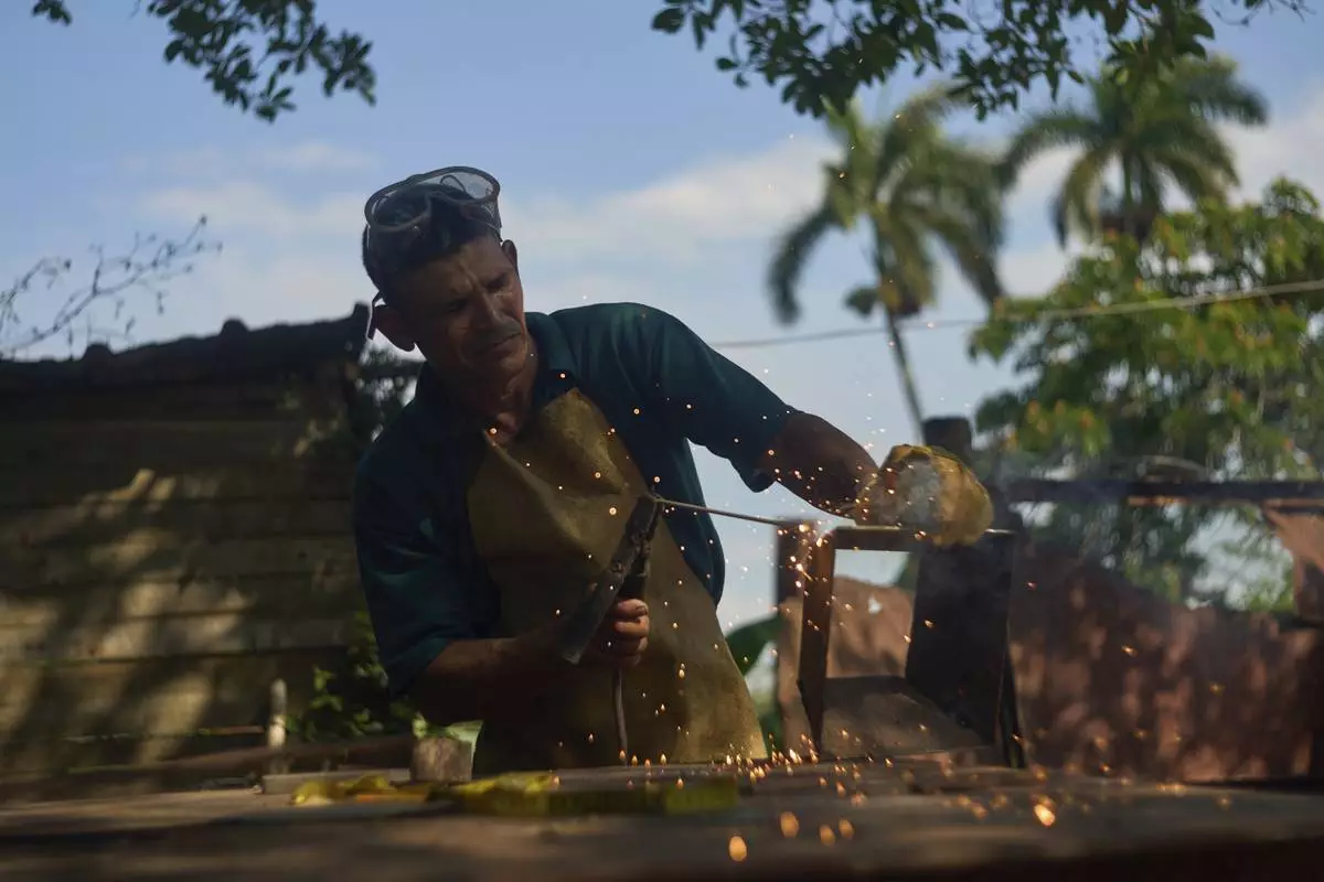 Blacksmith Edinector Vazquez builds a charcoal cooking stove to sell to residents looking to cook during blackouts in Minas, Havana province, Cuba, Friday, May 23, 2025. (AP Photo/Ramon Espinosa)