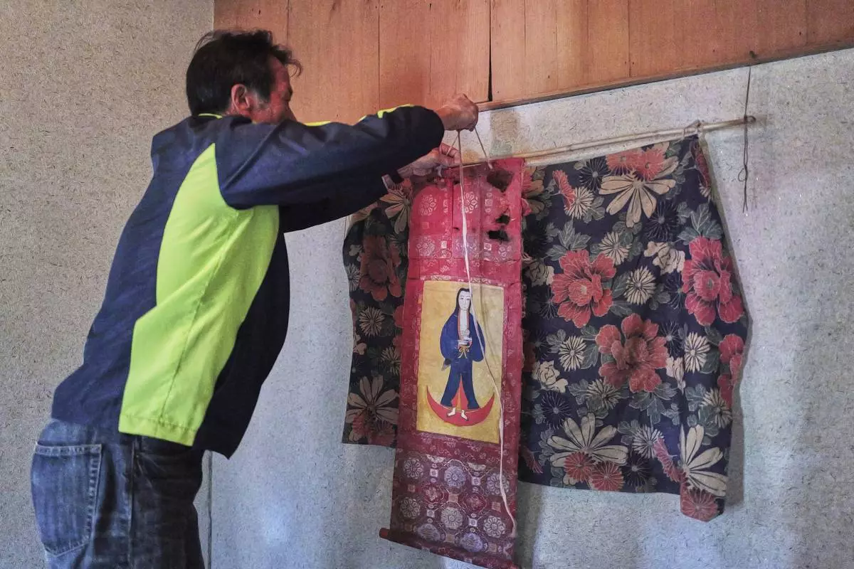 Masatsugu Tanimoto, a farmer and one of the few remaining hidden Christians on Ikitsuki Island, hangs a scroll of the Virgin Mary and Jesus once secretly worshipped at his home in Ikitsuki Island in Hirado, southern Japan, Sunday, April 27, 2025. (AP Photo/Eugene Hoshiko)