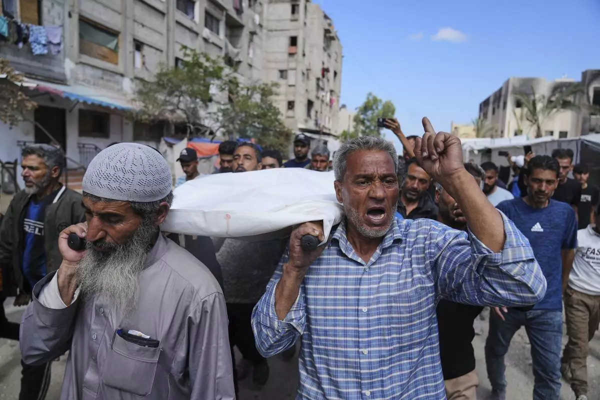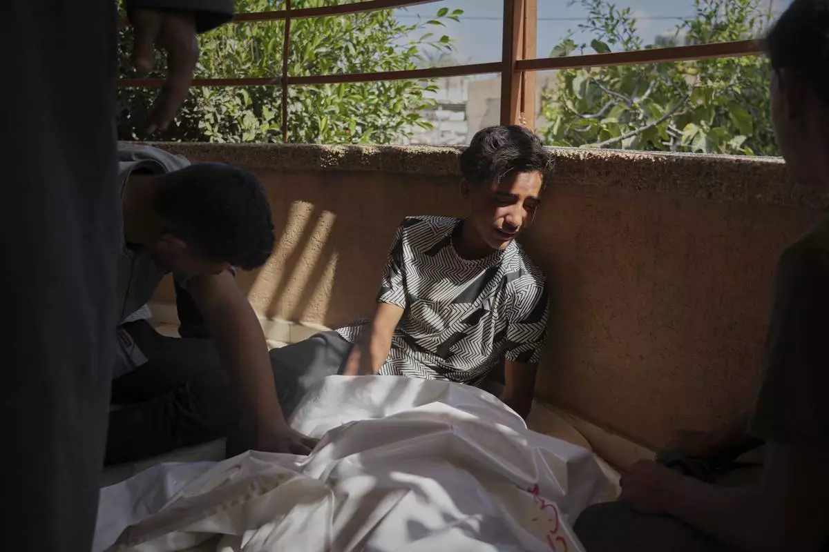 Palestinians mourn Abdul Rahman Al-Qudra, who was killed while heading to an aid distribution hub, in Khan Younis, Gaza Strip, Tuesday, June 3, 2025. (AP Photo/Abdel Kareem Hana)