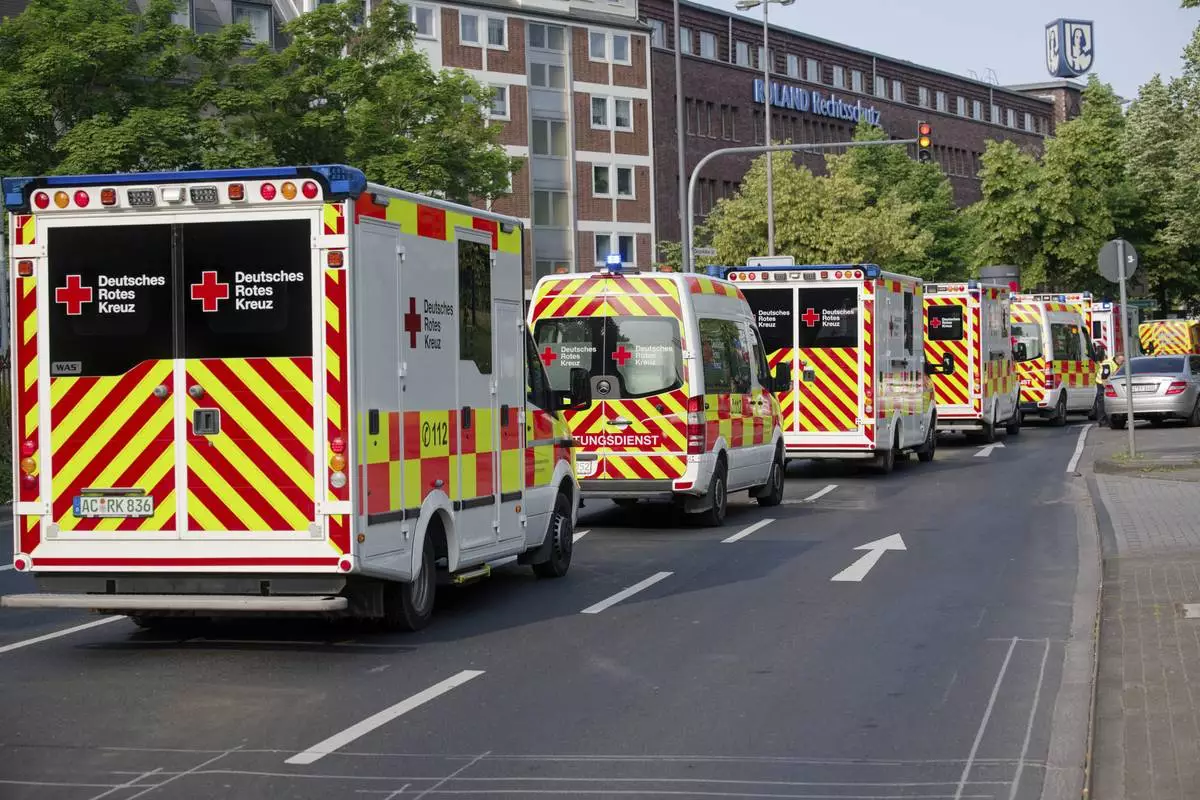 Ambulances drive to the Eduardus Hospital in Cologne-Deutz to evacuate the hospital before specialists defuse three unexploded U.S. bombs from World War II that were unearthed earlier this week in Cologne, Wednesday, June 4, 2025. (Henning Kaiser/dpa via AP)
