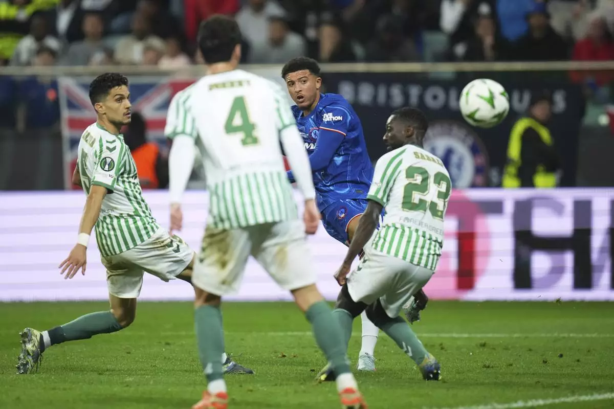 Chelsea's Jadon Sancho scores his side's third goal during the Europa Conference League final soccer match between Real Betis and Chelsea in Wroclaw, Poland, Wednesday, May 28, 2025.(AP Photo/Petr Josek)