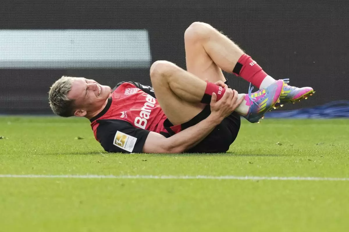 FILE -Leverkusen's Florian Wirtz lies on the pitch in pain during the German Bundesliga soccer match between Bayer Leverkusen and Union Berlin at the BayArena in Leverkusen, Germany, April 12, 2025. (AP Photo/Martin Meissner, File)