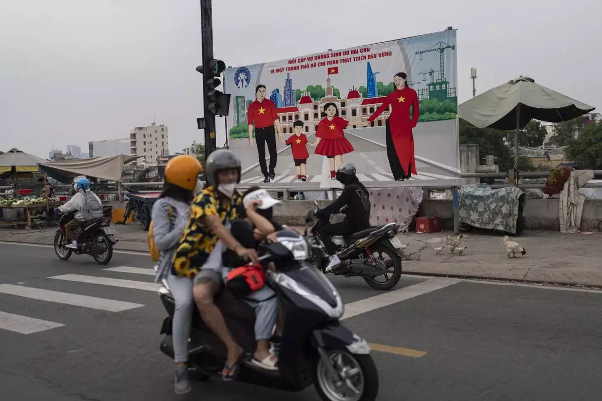 FILE -A billboard campaigning for each family to have two children in an effort to improve the birth rate stands along the street in Ho Chi Minh City, Vietnam, Jan. 14, 2024. (AP Photo/Jae C. Hong, File)