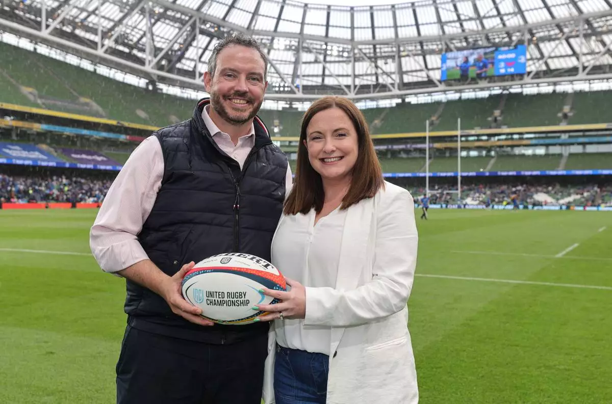 Jeff Davies, SVP of Finance and Operations at IPVanish, with United Rugby Championship Head of Operations Amy Monaghan at Aviva Stadium in Dublin on May 31, 2025, during the Quarter Final between Leinster and Scarlets.