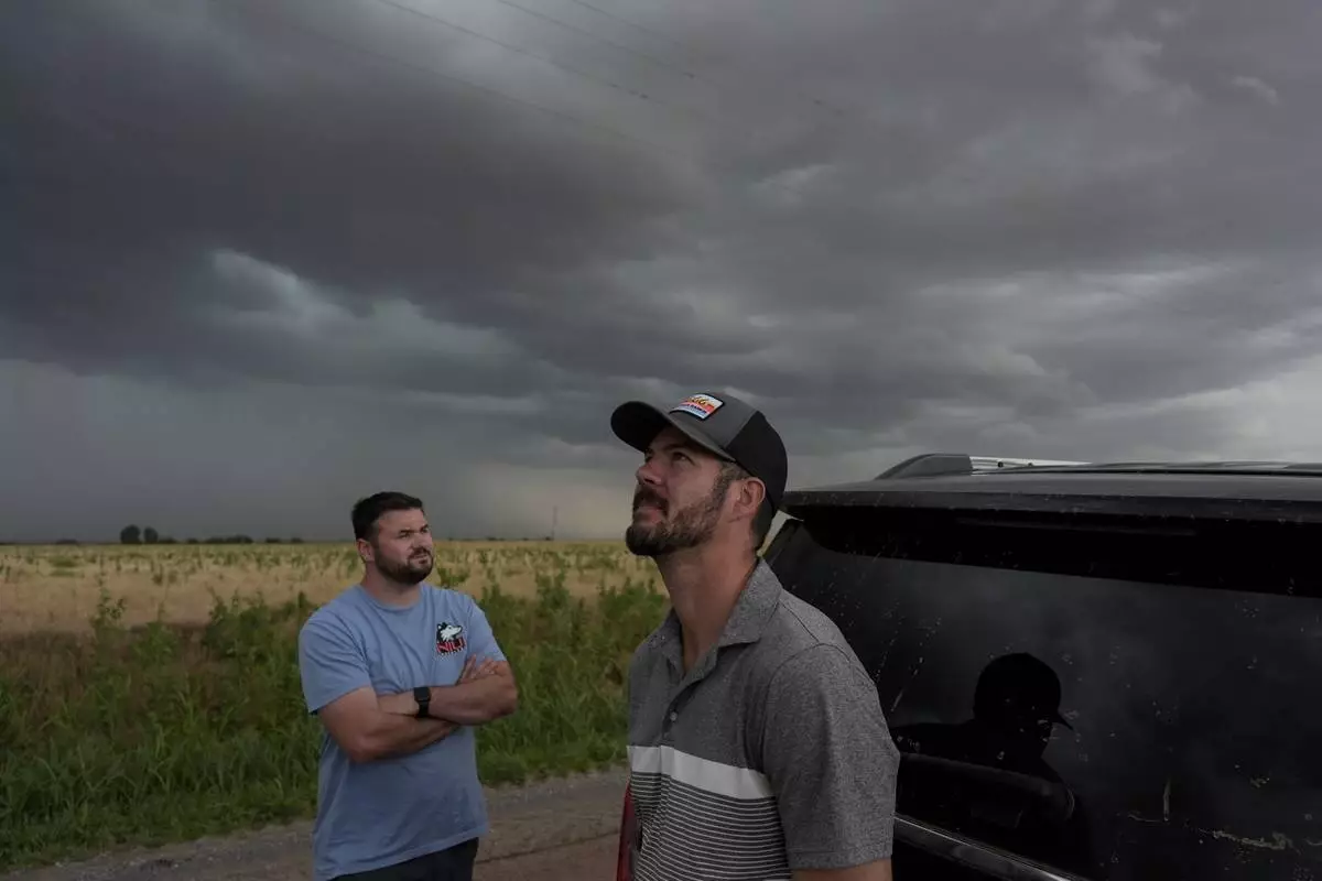 Victor Gensini, Northern Illinois University meteorology professor and a lead scientist of Project ICECHIP, right, and Logan Bundy, PhD Candidate at NIU and ICECHIP IOP assistant, left, stand at the command vehicle watching an approaching storm Tuesday, June 3, 2025, in Scotland, Texas. (AP Photo/Carolyn Kaster)