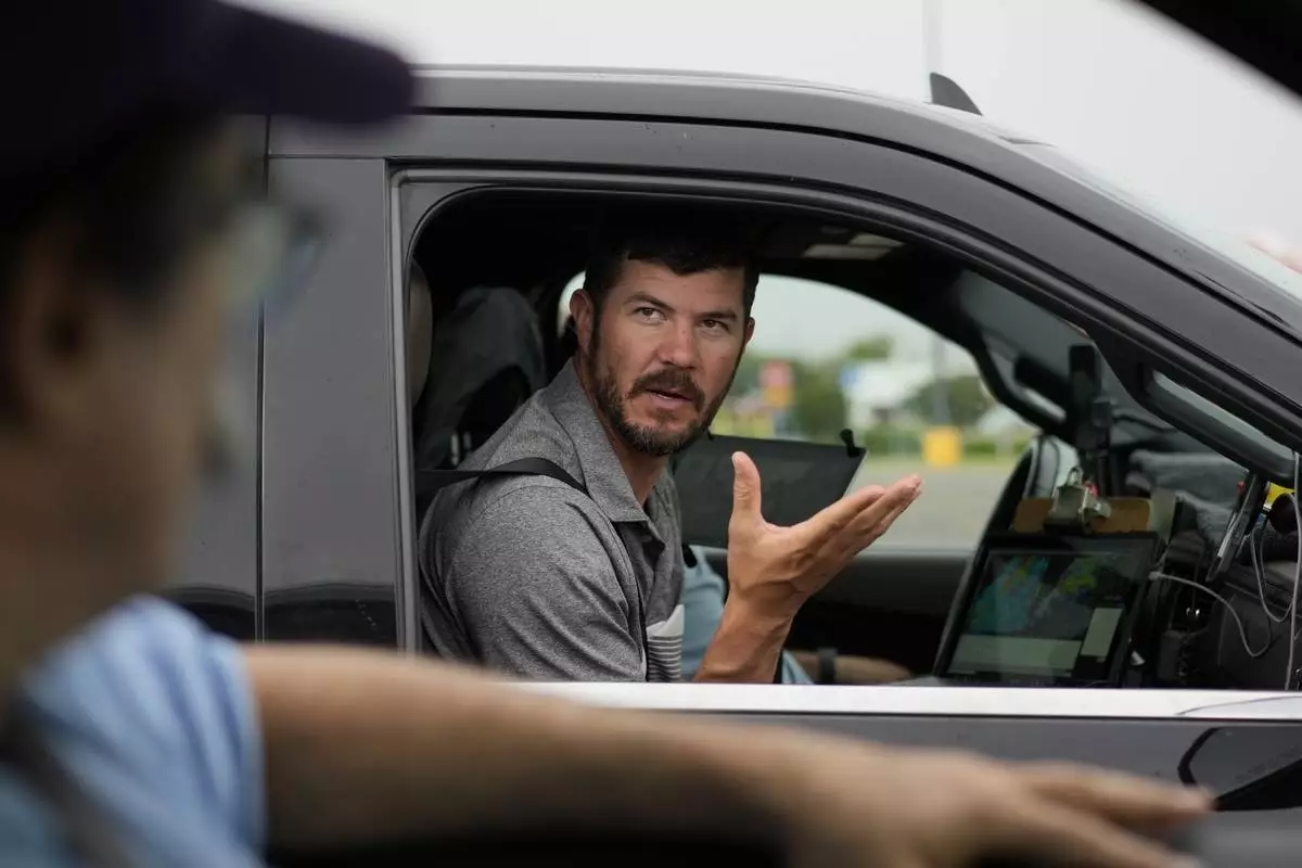 National Weather Service forecaster David Imy gestures to an approaching storm during a Project ICECHIP operation Tuesday, June 3, 2025, near Tipton, Okla. (AP Photo/Carolyn Kaster)