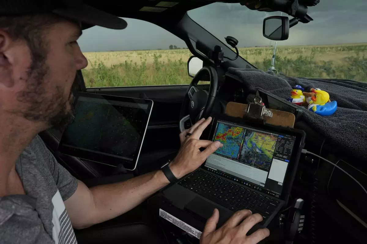 Victor Gensini, Northern Illinois University meteorology professor and a lead scientist of Project ICECHIP, checks storm data in the command vehicle during an operation Tuesday, June 3, 2025, south of Tipton, Okla.(AP Photo/Carolyn Kaster)
