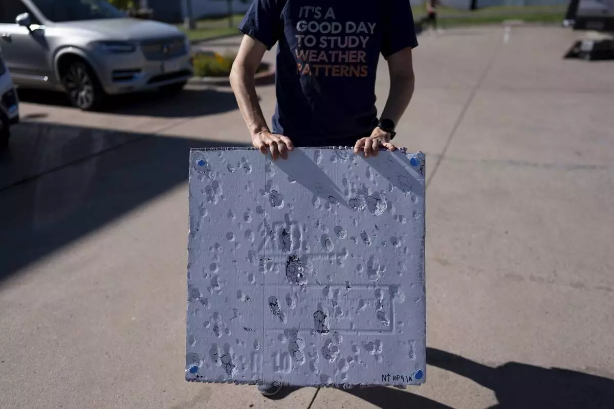 Hannah Vagasky holds a foam board hail pad covered with impact dents in a parking lot Tuesday, June 3, 2025, in Shamrock, Texas, as the team prepares for a day of hailstorm chasing. The hail pad is used to measure the size, angle of impact and intensity of hail. (AP Photo/Carolyn Kaster)