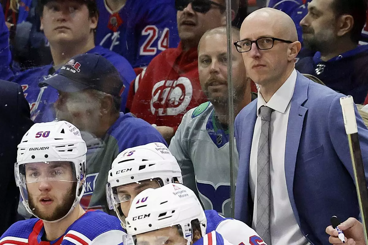 New York Rangers assistant coach Dan Muse, right, watches during the third period in Game 4 of an NHL hockey Stanley Cup second-round playoff series in Raleigh, N.C., Saturday, May 11, 2024. (AP Photo/Karl B DeBlaker File)