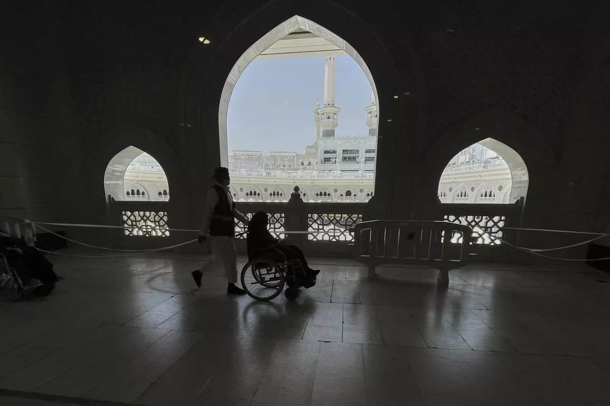 A Muslim pilgrim on a wheelchair in the Kaaba, the cubic building at the Grand Mosque, during the annual Hajj pilgrimage, in the Muslim holy city of Mecca, Saudi Arabia, Wednesday, June 4, 2025. (AP Photo/Amr Nabil)