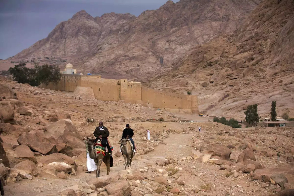FILE - Visitors leave Saint Catherine's Monastery in Saint Catherine, Egypt, Dec. 9, 2013. (AP Photo/Hiro Komae, File)
