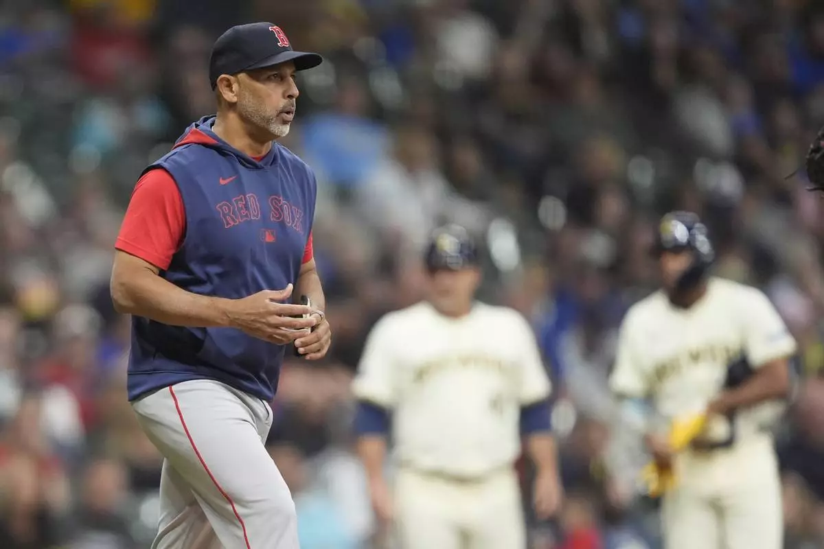 Boston Red Sox manager Alex Cora walks to the mound to make a pitching change during the sixth inning of a baseball game against the Milwaukee Brewers, Tuesday, May 27, 2025, in Milwaukee. (AP Photo/Aaron Gash)