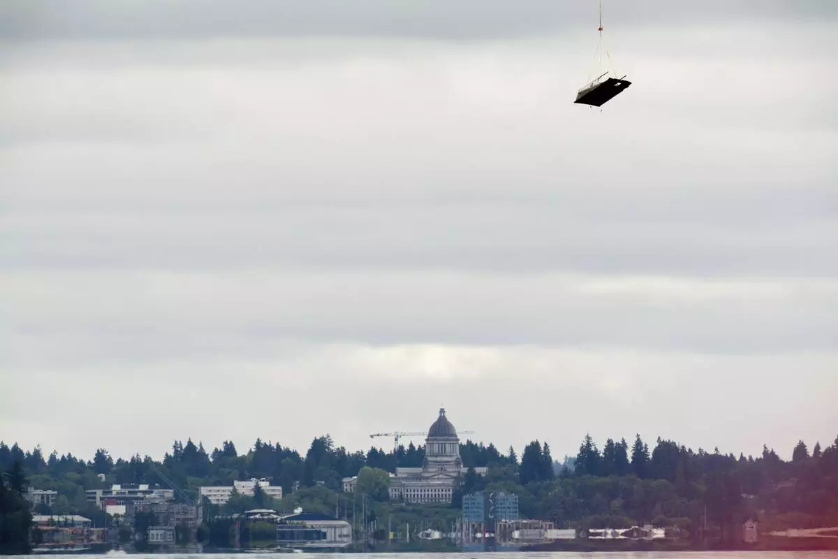 An abandoned ship is lowered from a helicopter on Wednesday, June 4, 2025, in Olympia, Wash. (AP Photo/Jenny Kane)