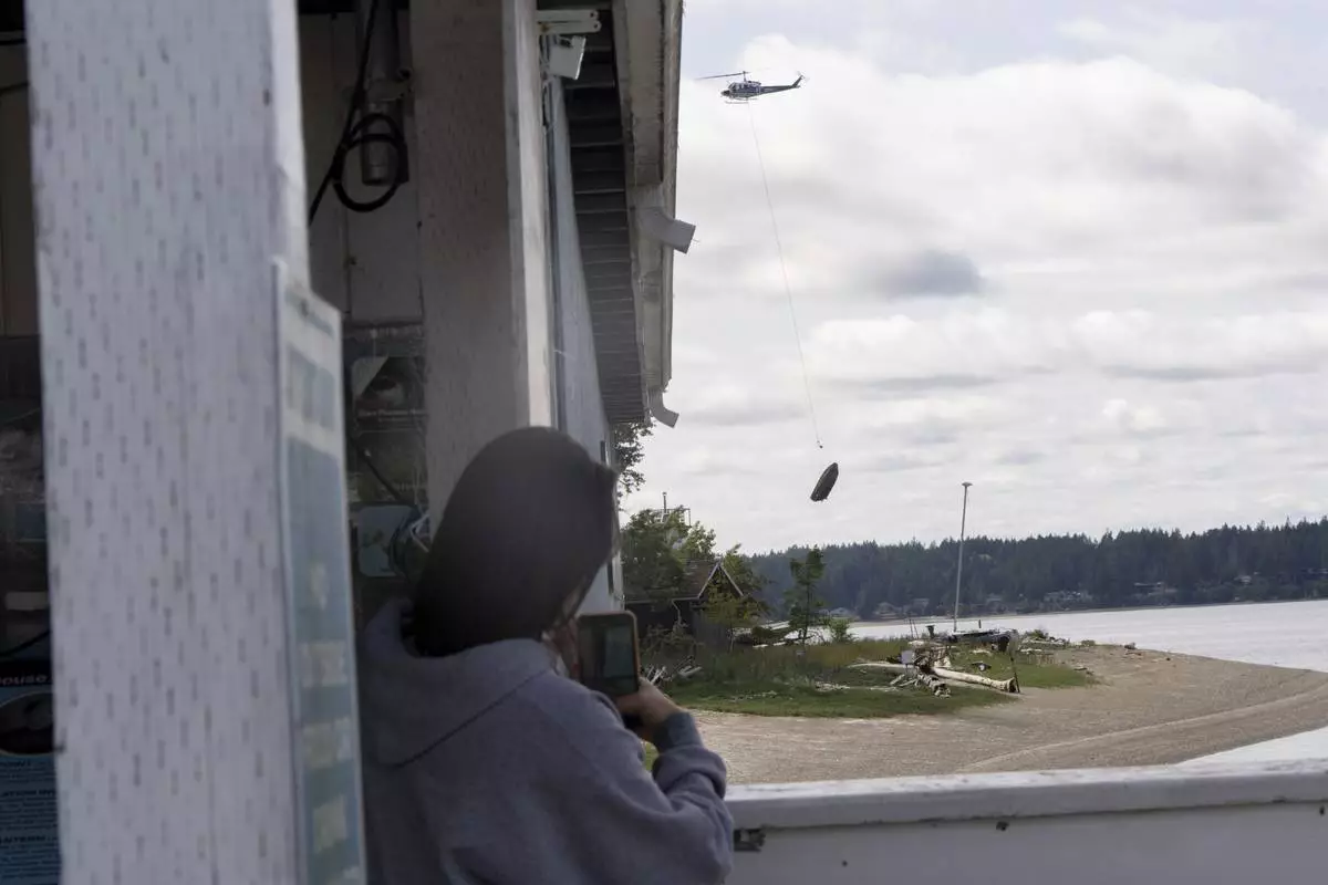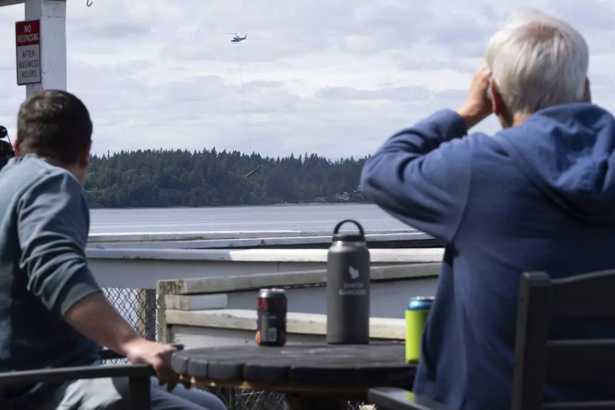 People watch as a helicopter carries an abandoned ship from Squaxin Island to shore on Wednesday, June 4, 2025, in Olympia, Wash. (AP Photo/Jenny Kane)