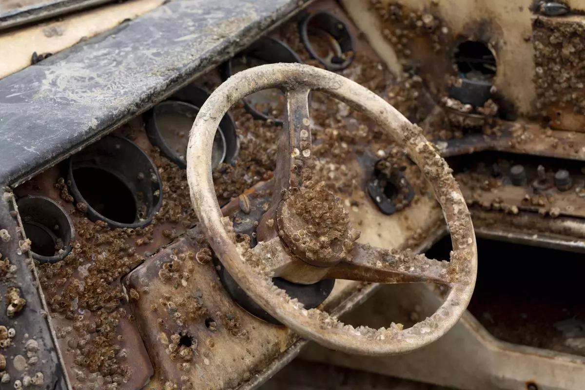 A steering wheel of an abandoned ship is covered in barnacles on Wednesday, June 4, 2025, in Olympia, Wash. (AP Photo/Jenny Kane)