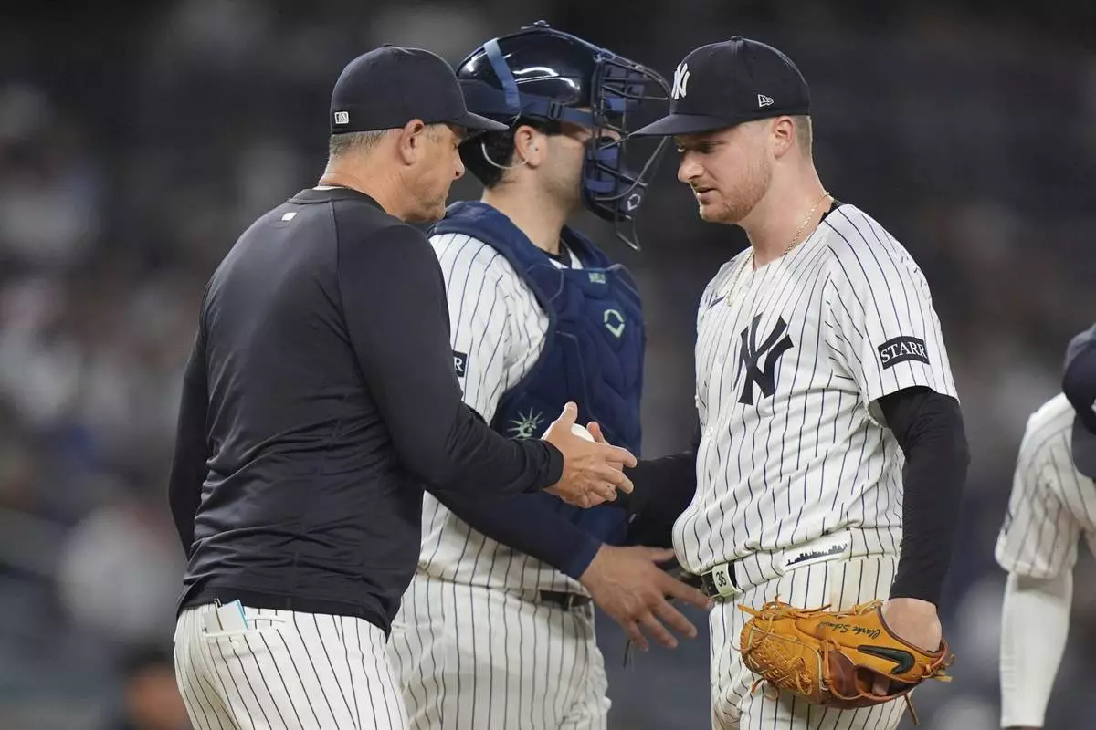 New York Yankees pitcher Clarke Schmidt hands the ball to manager Aaron Boone as he leaves during the sixth inning of a baseball game, Wednesday, June 4, 2025, in New York. (AP Photo/Frank Franklin II)